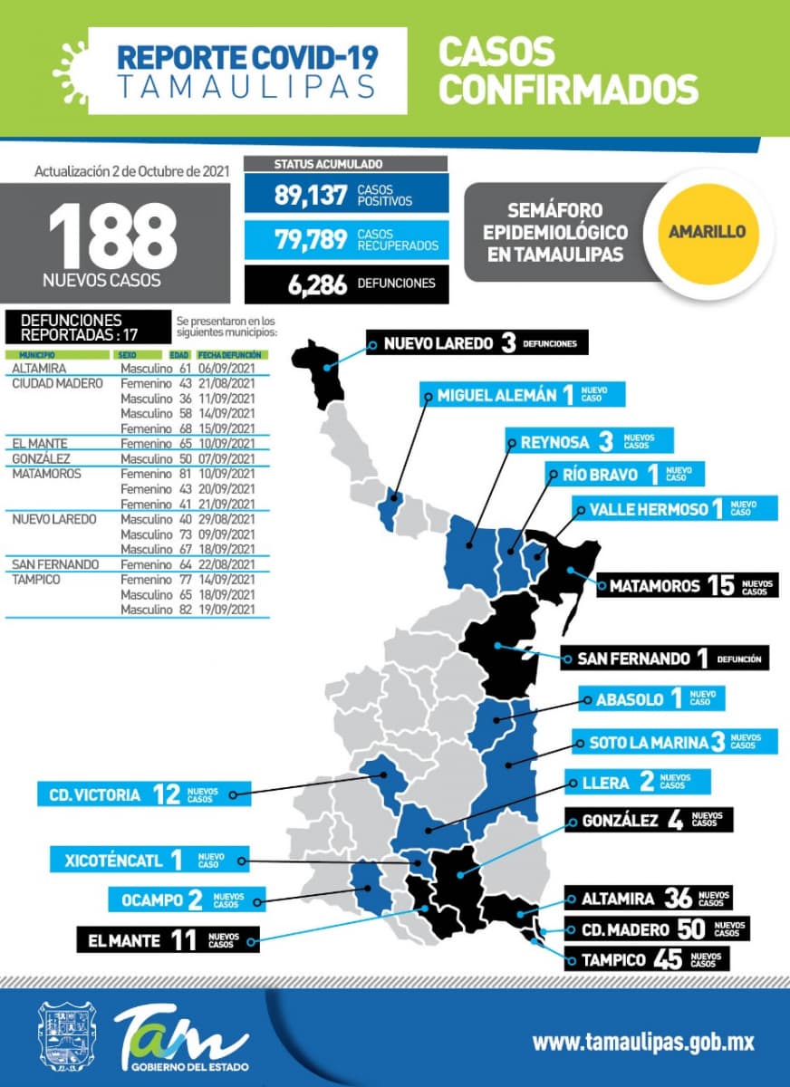 CIUDAD VICTORIA, Tamaulipas.- Tamaulipas cerró la jornada de este sábado con 188 nuevos contagios de COVID-19 y 17 fallecimientos, informó en su reporte diario la secretaria de Salud, Gloria Molina Gamboa quien reiteró el llamado a mantener el control de enfermedades como obesidad, hipertensión y diabetes para disminuir el riesgo de complicaciones graves.