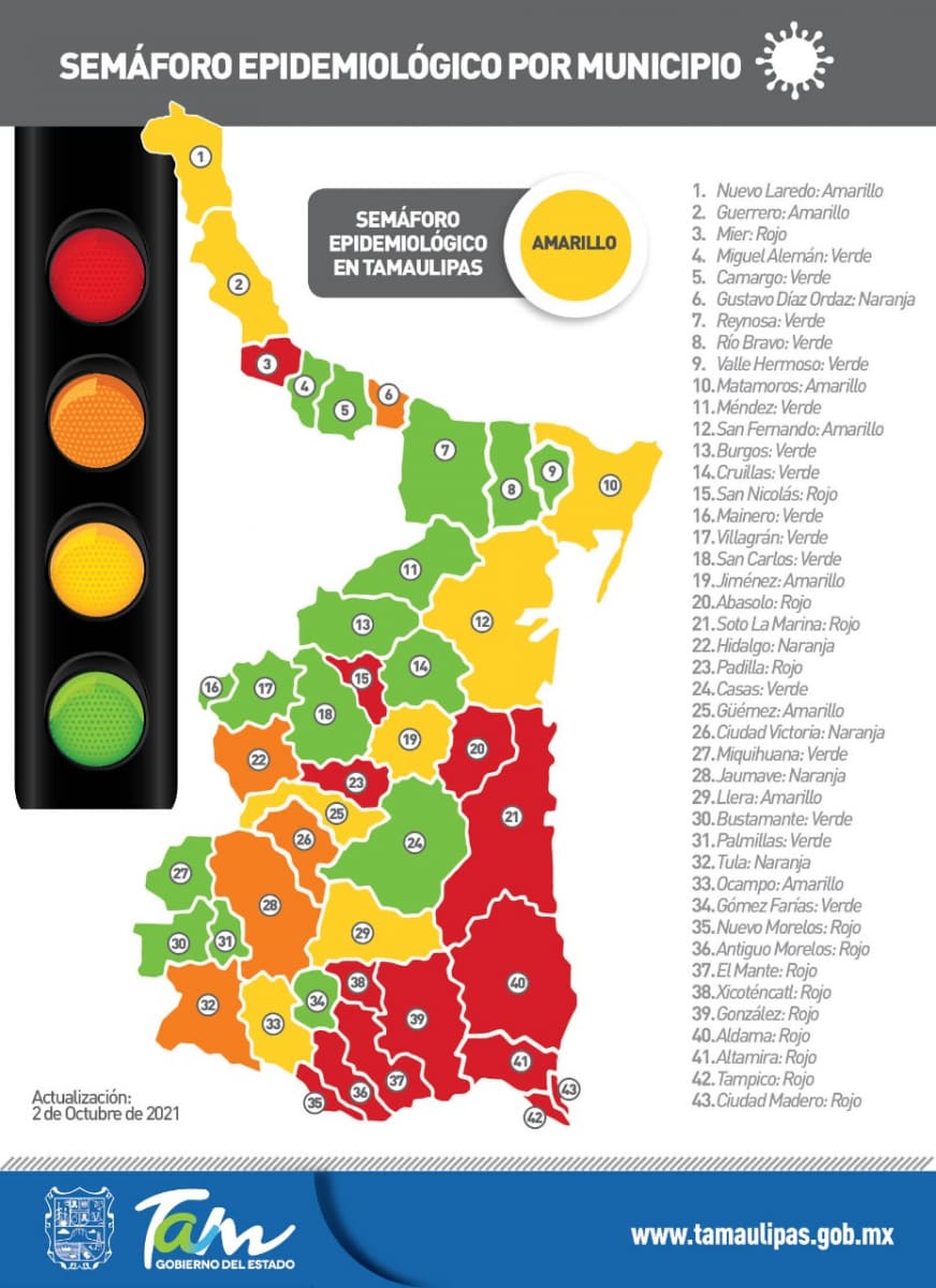 Añadió que Tamaulipas se encuentra en semáforo epidemiológico color amarillo, por lo que pidió atender las medidas de prevención ya conocidas para reducir la probabilidad de contagios, disminuir casos, hospitalizaciones y fallecimientos.