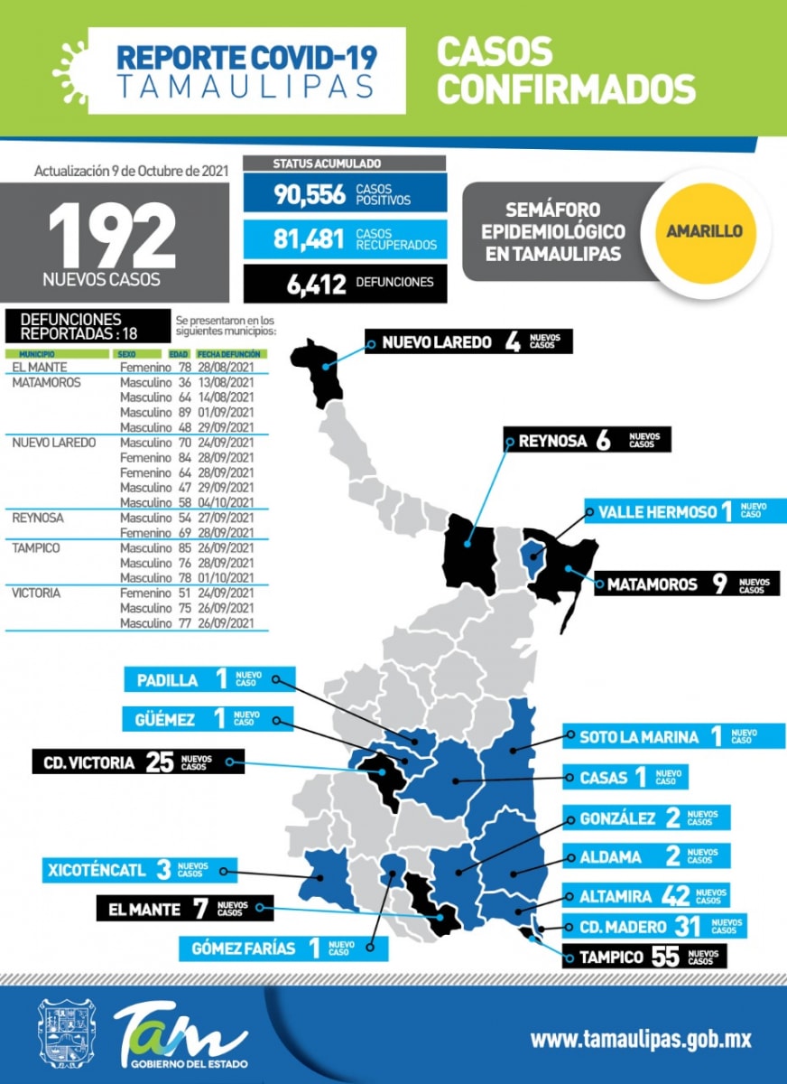 CIUDAD VICTORIA, Tamaulipas.- Tamaulipas cerró la jornada de este sábado con 192 pacientes positivos a COVID-19 y 18 fallecimientos, informó la secretaria de Salud, Gloria Molina Gamboa al reiterar la importancia del uso del cubrebocas, la sana distancia y el lavado de manos para evitar rebrotes de la enfermedad.