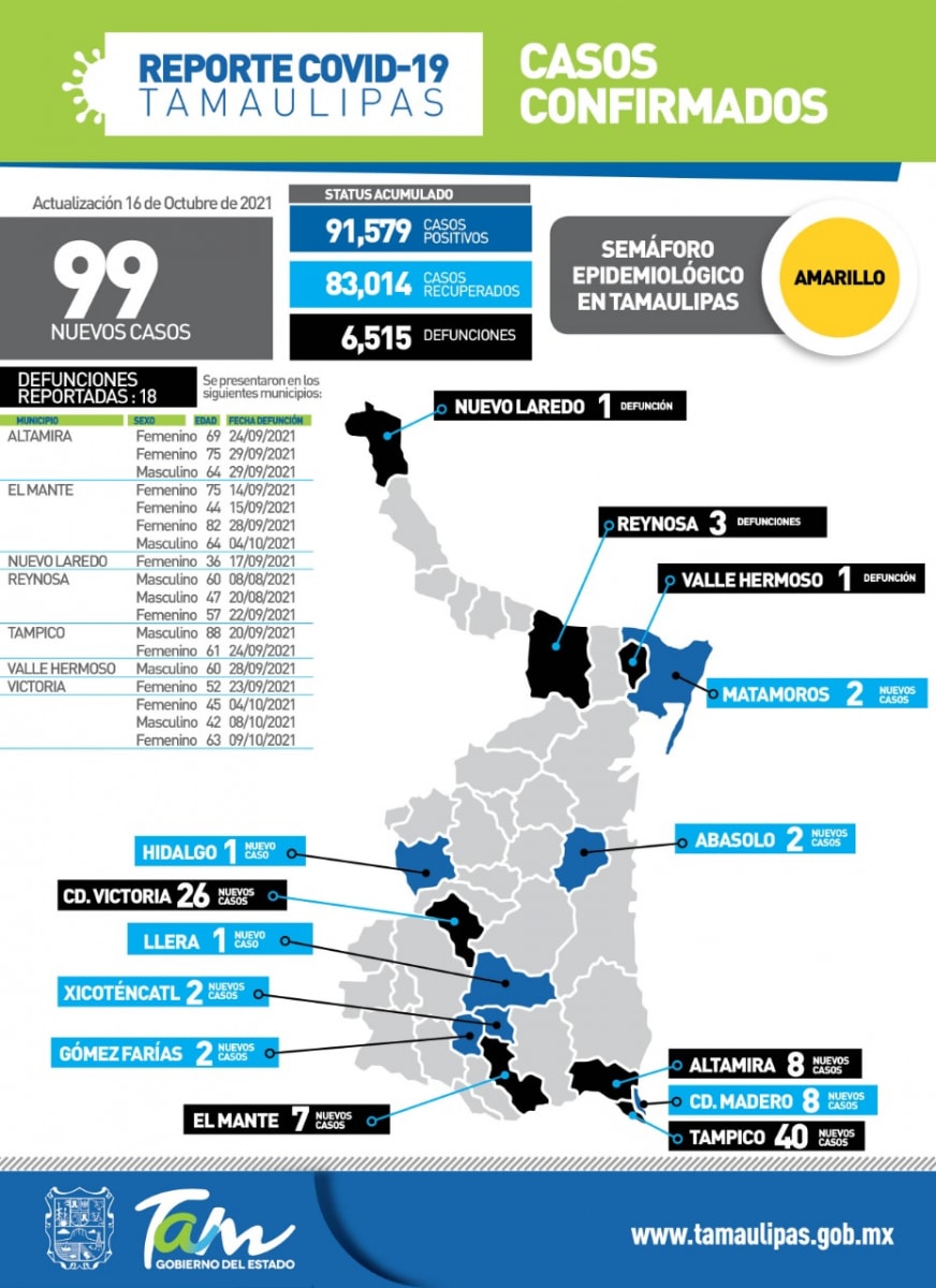 CIUDAD VICTORIA, Tamaulipas.- Durante las últimas 24 horas Tamaulipas disminuyó la cifra de contagios de COVID-19 a 99 casos y 18 fallecimientos, como resultado del reforzamiento de las medidas preventivas y el avance en la estrategia de vacunación, informó la secretaria de Salud, Gloria Molina Gamboa.