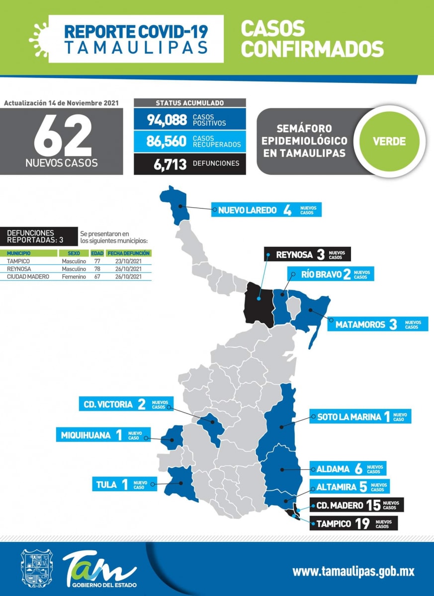 CIUDAD VICTORIA, Tamaulipas.- Luego de confirmar 62 nuevos casos y 3 fallecimientos por COVID-19, la secretaria de Salud de Tamaulipas, Gloria Molina Gamboa urgió a la población a evitar aglomeraciones y reuniones sociales durante el fin de semana largo para disminuir la probabilidad de contagio y un repunte de la enfermedad.