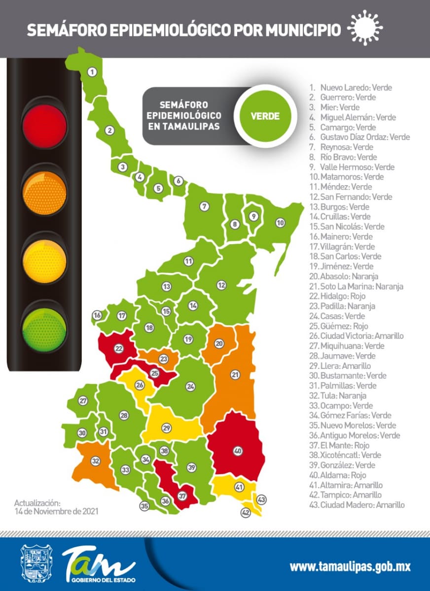 Subrayó que Tamaulipas se encuentra en semáforo de riesgo epidemiológico color verde ante el descenso en los casos, hospitalizaciones y defunciones, sin embargo, insistió en seguir reforzando las medidas de prevención como si estuviéramos en riesgo elevado para avanzar hacia la nueva normalidad y la convivencia segura.