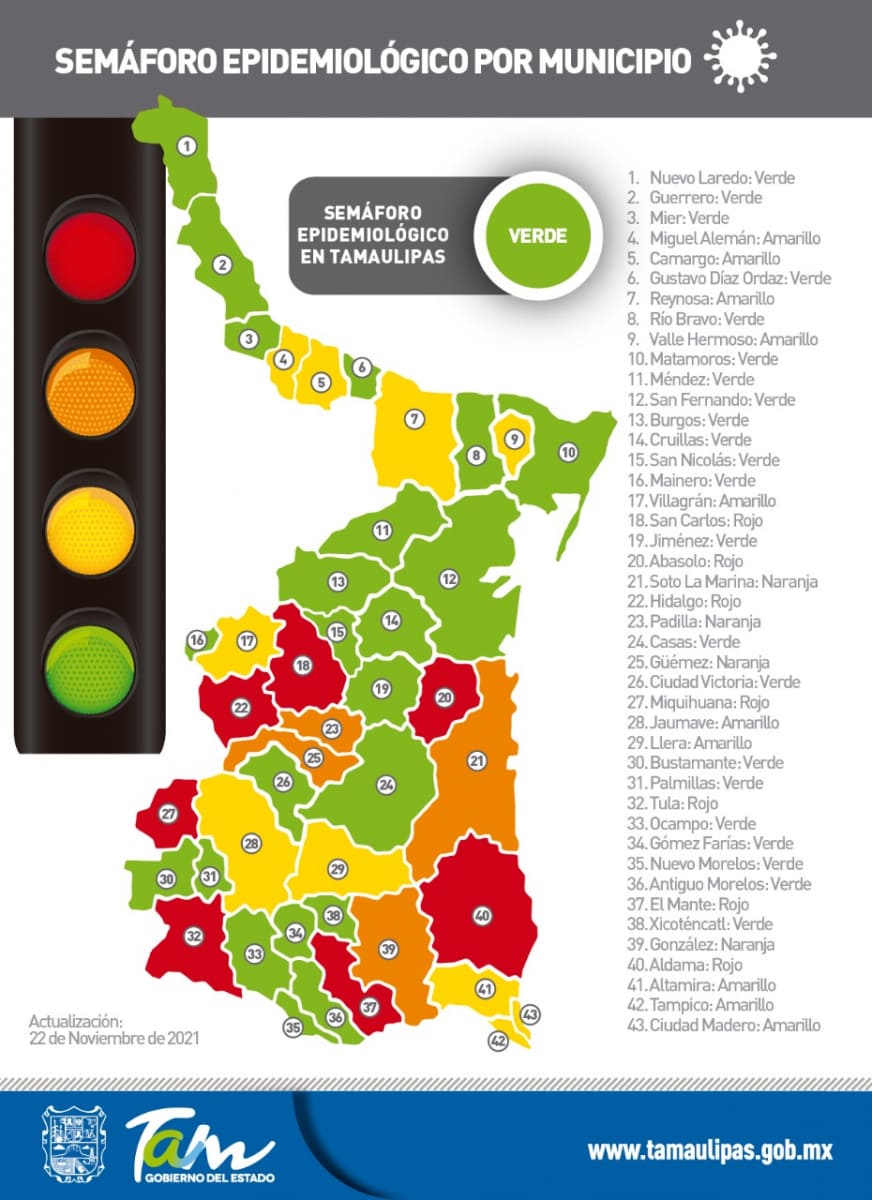Ante ello, dijo, es fundamental atender las recomendaciones emitidas por el gobierno de Tamaulipas como son el uso del cubrebocas, respetar la sana distancia, lavarse las manos frecuentemente, aplicarse la vacuna contra COVID-19 e influenza, mantener el control de enfermedades como obesidad, hipertensión o diabetes y evitar reuniones sociales o sitios aglomerados donde no se respeten estas medidas.