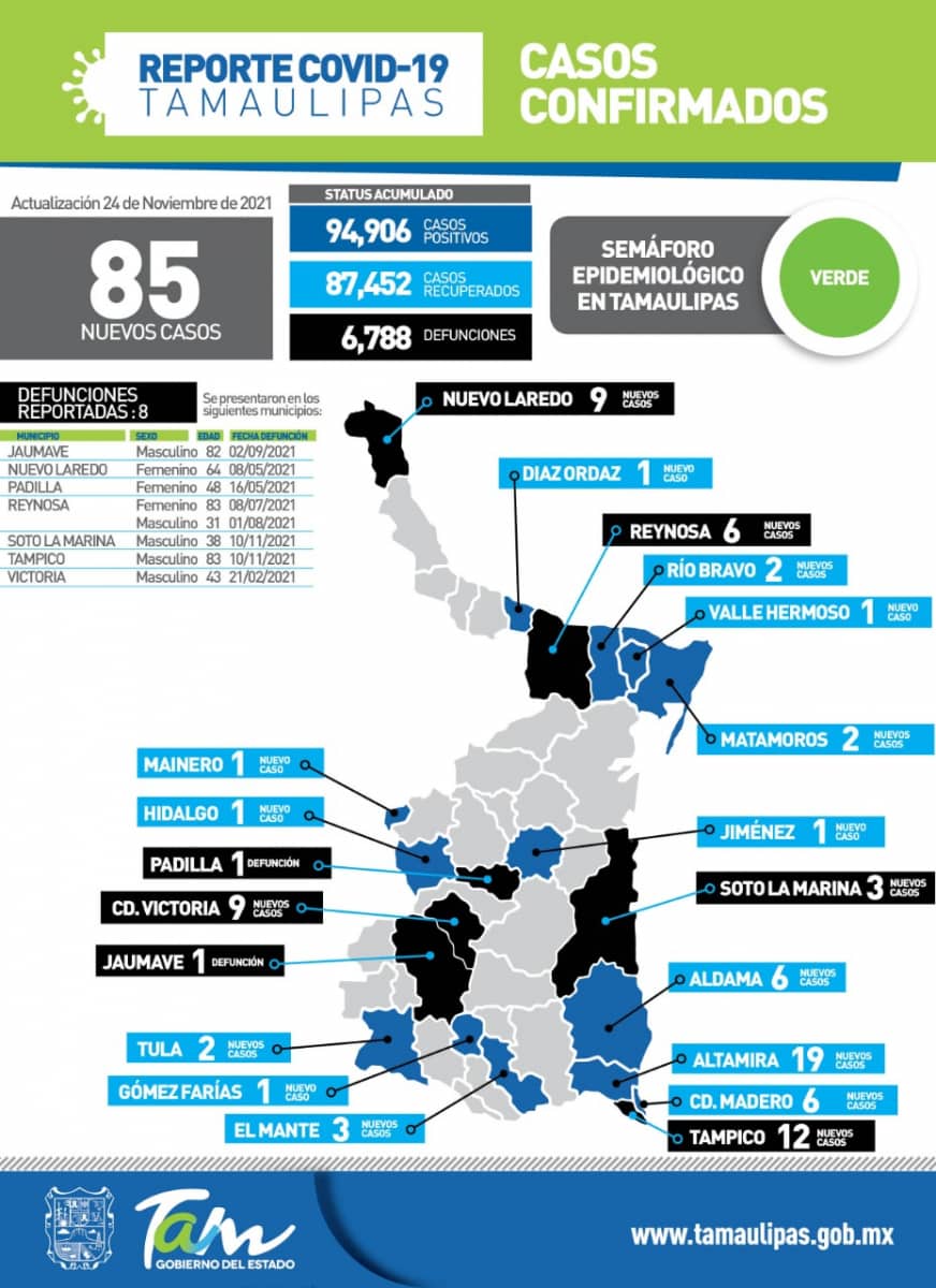 CIUDAD VICTORIA, Tamaulipas.- Durante la jornada de este miércoles, Tamaulipas sumó 85 nuevos casos de COVID-19 a su conteo oficial, señaló la secretaria de Salud, Gloria Molina Gamboa luego de reiterar su llamado a evitar aglomeraciones, limitar el contacto con otras personas y seguir en todo momento las medidas de protección sanitaria.