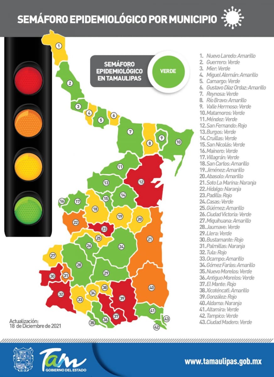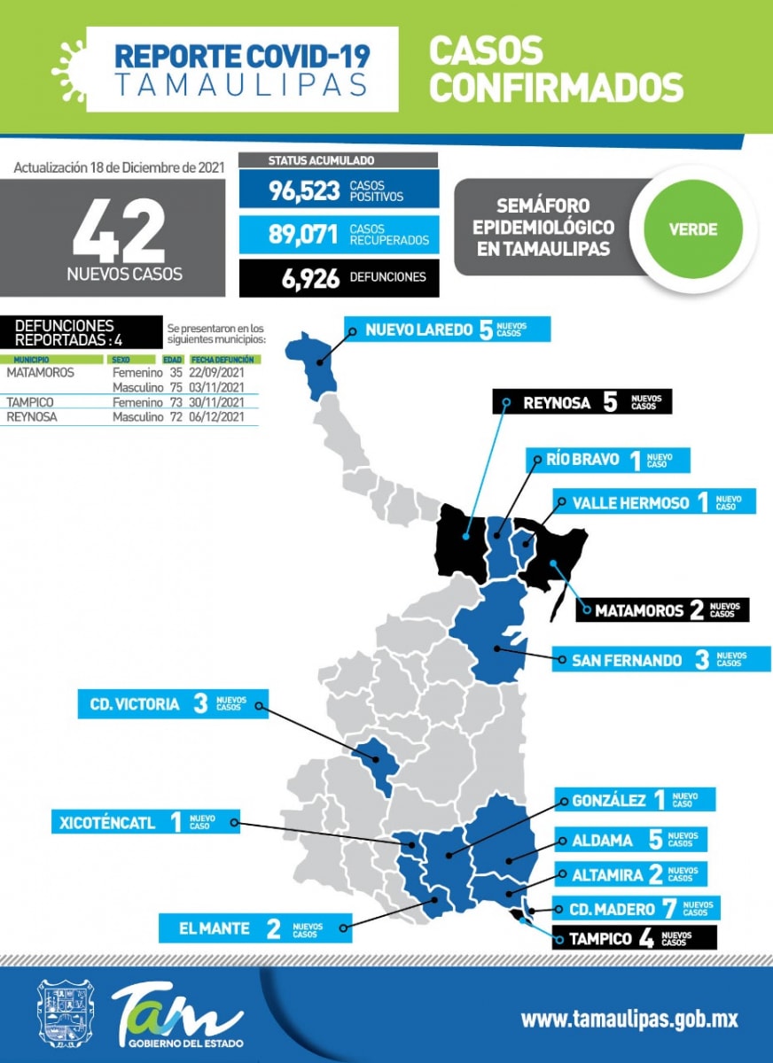 CIUDAD VICTORIA, Tamaulipas.- En su reporte diario sobre el estado de la pandemia, la secretaria de Salud de Tamaulipas, Gloria Molina Gamboa confirmó 42 nuevos casos de COVID-19 y 4 fallecimientos, por lo que reiteró el llamado a reforzar las medidas de prevención ya conocidas para evitar una nueva ola de contagio o la circulación de la variante Ómicron.