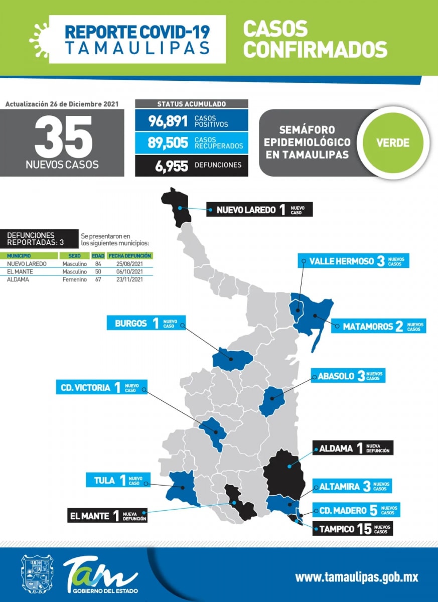 CIUDAD VICTORIA, TAMAULIPAS.- Tamaulipas cerró la jornada de este domingo con 35 casos de COVID-19 y 3 fallecimientos asociados a complicaciones graves, informó desde esta ciudad capital, la secretaria de Salud, Gloria Molina Gamboa al presentar el reporte diario.
