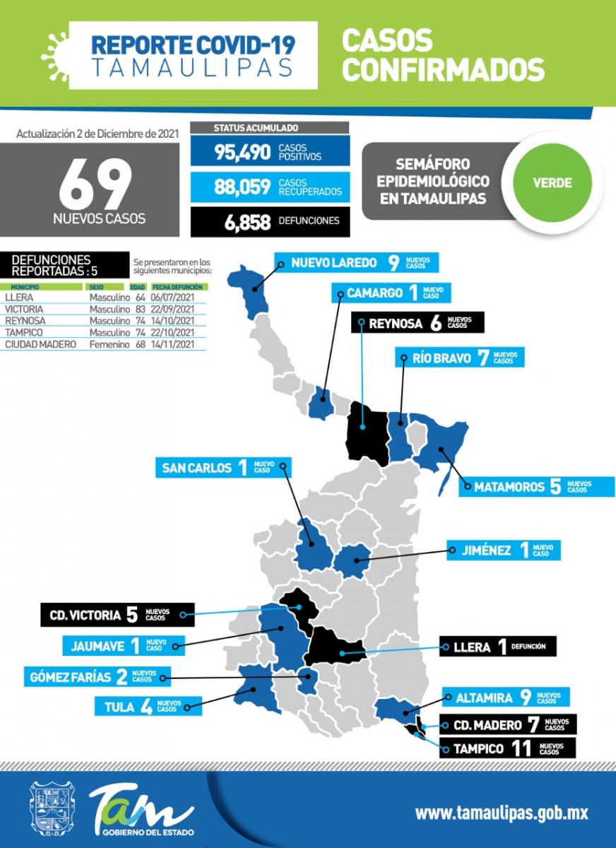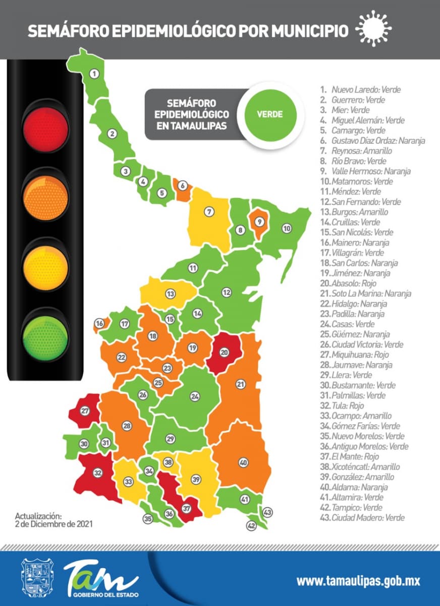 Precisó que Tamaulipas se mantiene en semáforo de riesgo epidemiológico color verde, sin embargo, pidió no relajar las medidas de seguridad sanitaria ante la proximidad de las fiestas decembrinas y posibilidad de que la nueva variante Ómicron llegue a México y a Tamaulipas.