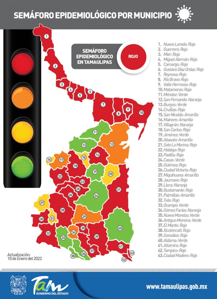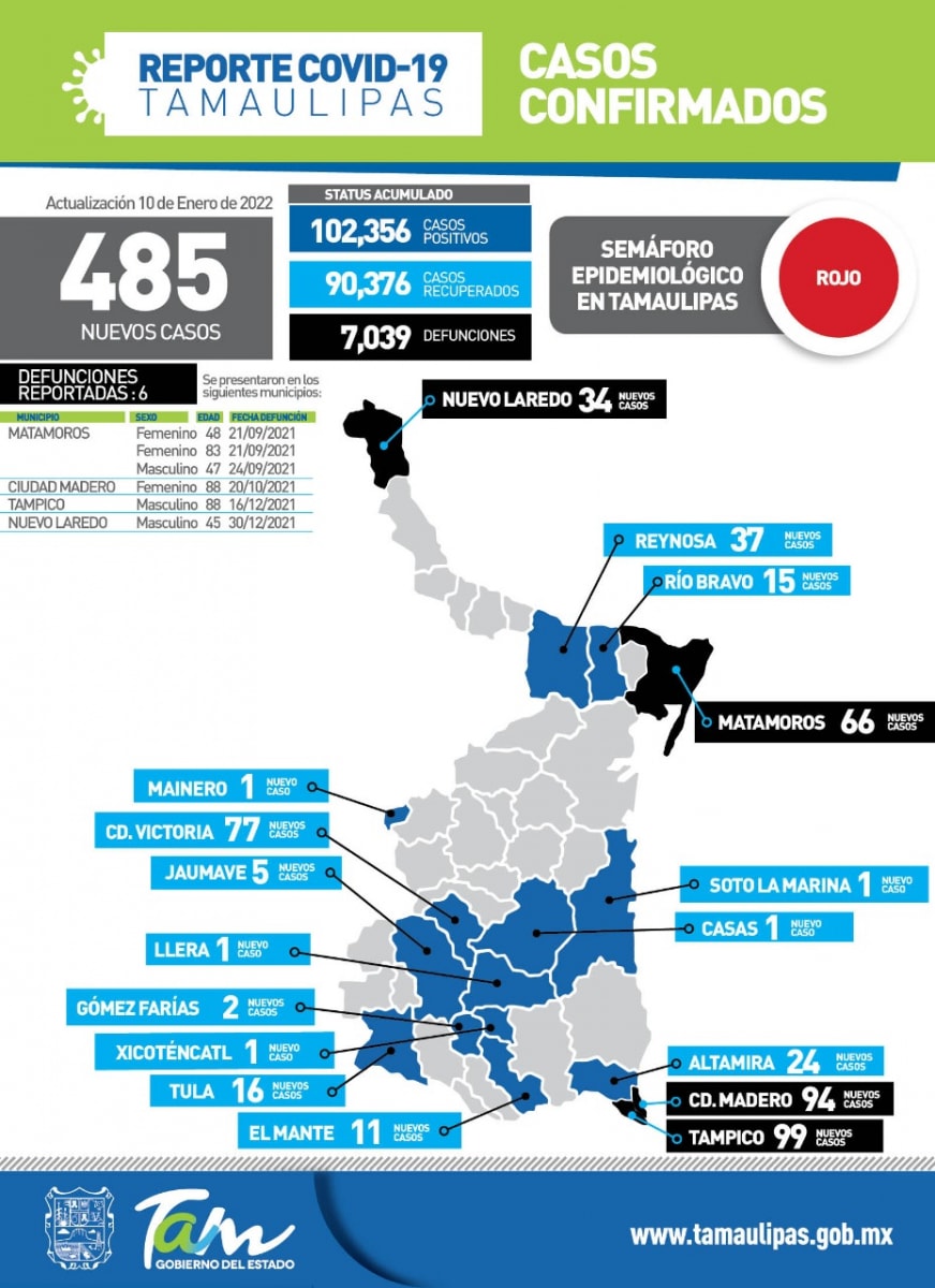 CIUDAD VICTORIA, TAMAULIPAS.- Tamaulipas cerró la jornada de este lunes con 485 positivos a COVID-19, 6 defunciones en pacientes con comorbilidades y en semáforo de riesgo epidemiológico color rojo, informó la secretaria de Salud, Gloria Molina Gamboa luego de hacer un llamado urgente a extremar las medidas de seguridad sanitaria para desacelerar la transmisión del virus.