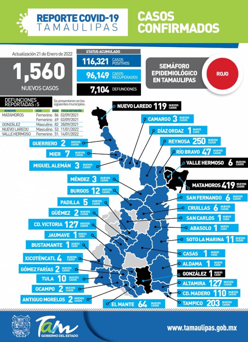 CIUDAD VICTORIA, TAMAULIPAS.- Tamaulipas cerró la jornada de este viernes con 1560 nuevos casos de COVID-19 y 5 fallecimientos asociados a complicaciones graves por el virus, informó desde esta ciudad capital la secretaria de Salud, Gloria Molina Gamboa quien insistió en su llamado a completar el esquema de vacunación y reforzar las medidas preventivas.