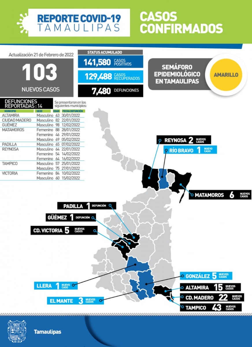 CIUDAD VICTORIA, TAMAULIPAS.- Al confirmar 103 nuevos casos de COVID-19 y 14 fallecimientos asociados a complicaciones graves, la Secretaría de Salud de Tamaulipas reiteró el llamado a completar el esquema de vacunación, aplicarse la dosis de refuerzo y limitar el contacto social para cortar la cadena de transmisión del virus.