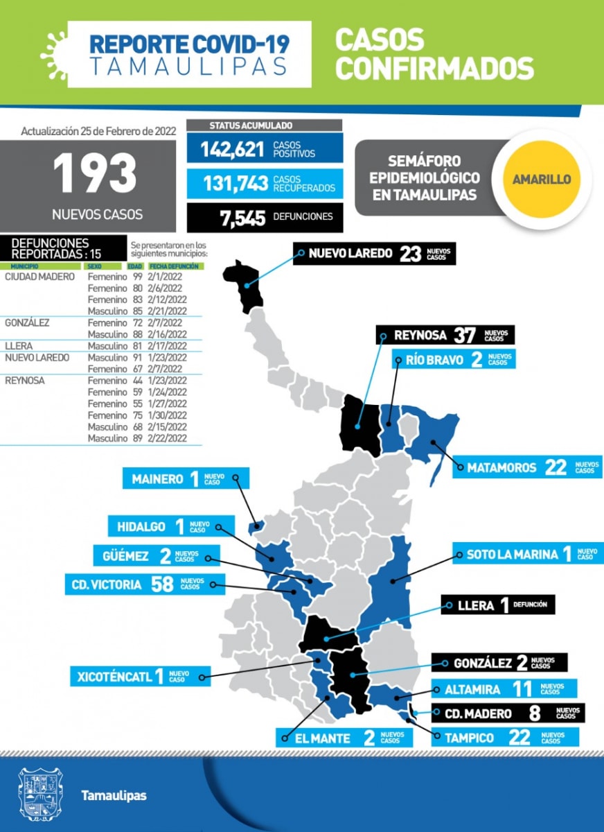 CIUDAD VICTORIA, TAMAULIPAS.- En su reporte COVID-19 de este viernes, la Secretaría de Salud de Tamaulipas confirmó 193 positivos y 15 defunciones, insistiendo en su llamado a proteger a los más vulnerables y evitar sitios aglomerados para cortar la cadena de transmisión de virus.