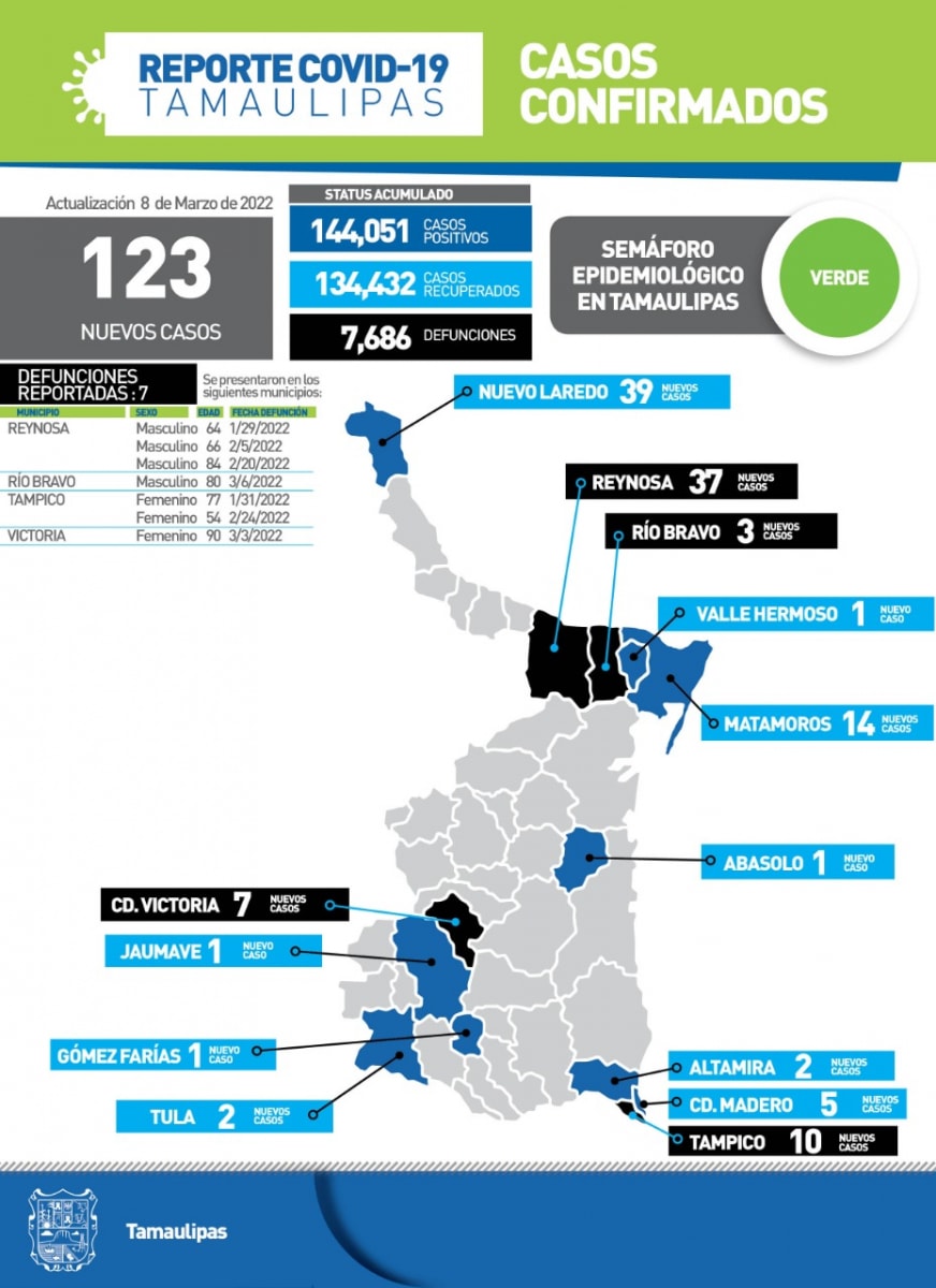 CIUDAD VICTORIA, TAMAULIPAS.- Tamaulipas cerró la jornada de este martes con 123 nuevos contagios y 7 fallecimientos por COVID-19, informó la Secretaría de Salud tras reiterar su llamado a respetar en el hogar, la escuela, el trabajo y los espacios públicos, las medidas de prevención ya conocidas y comprobadas contra la enfermedad.