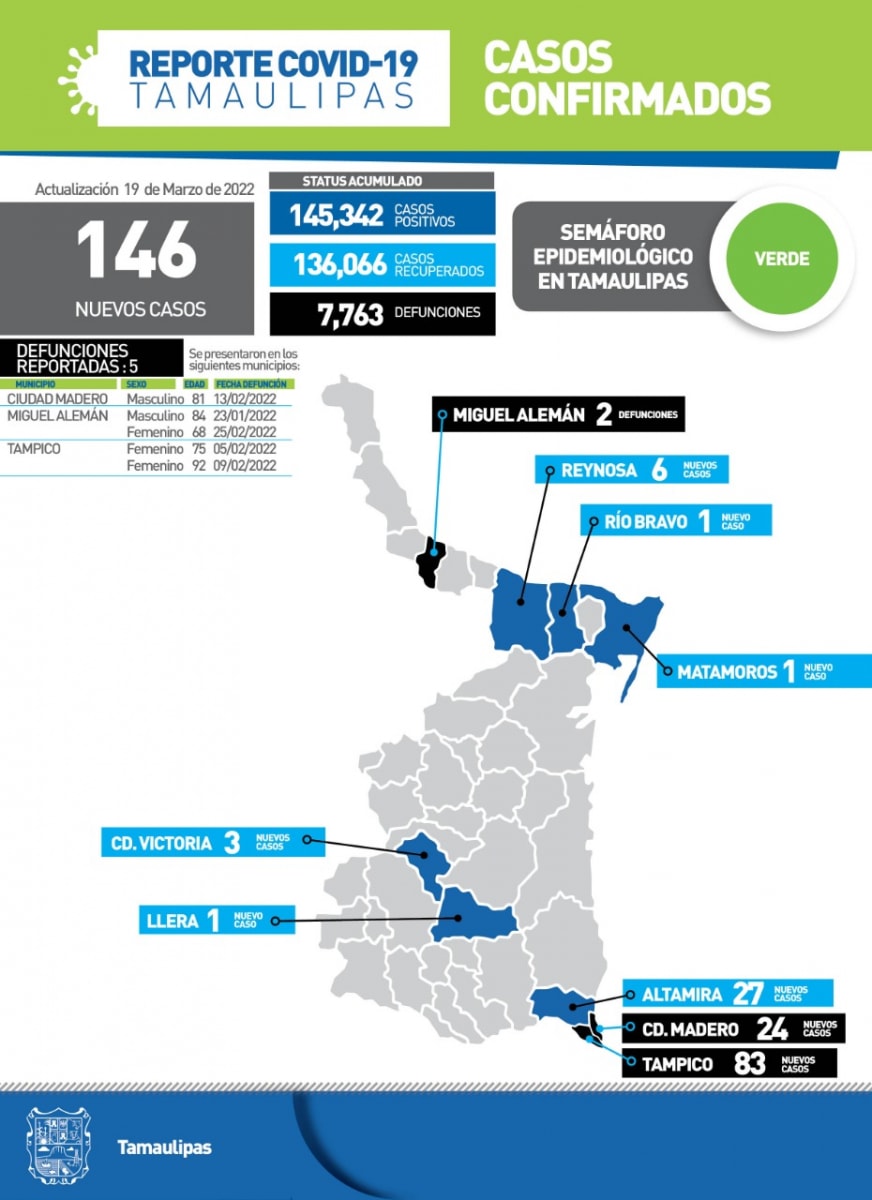 CIUDAD VICTORIA, TAMAULIPAS.- Tamaulipas cerró la jornada de hoy con 146 casos de COVID-19 y 5 fallecimientos asociados a complicaciones graves, informó la Secretaría de Salud luego de pedir a la población fortalecer las medidas de seguridad sanitaria para evitar un rebrote de la enfermedad.