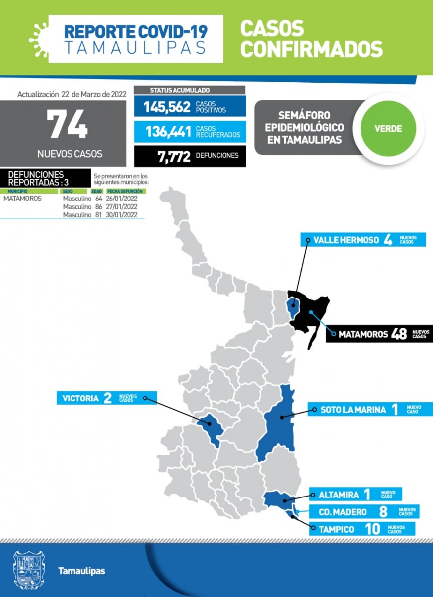 Al presentar el reporte diario, la Secretaría de Salud del estado confirmó 74 nuevos casos y 3 defunciones por el virus, insistiendo en su llamado a completar el esquema de vacunación y atender en todo momento el uso del cubrebocas, el lavado de manos y la sana distancia para disminuir el riesgo de infección.
