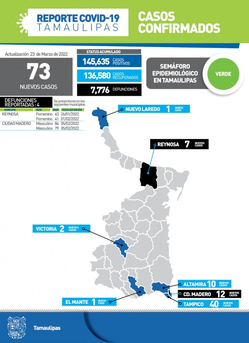 CIUDAD VICTORIA, TAMAULIPAS.- La pandemia de COVID-19 sumó este miércoles 73 positivos y 4 fallecimientos a su conteo oficial, informó en su reporte diario la Secretaría de Salud de Tamaulipas.