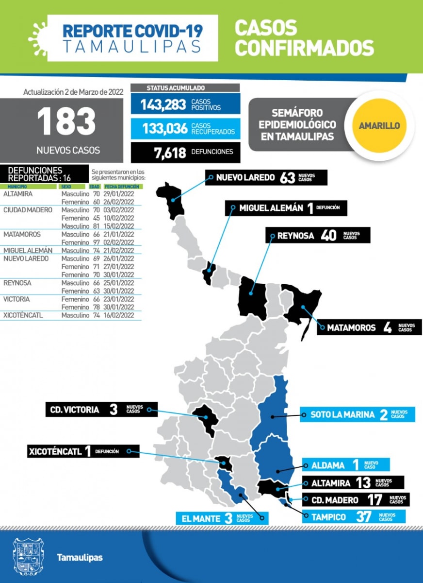 CIUDAD VICTORIA, TAMAULIPAS.- La pandemia de COVID-19 contabilizó 183 nuevos casos en Tamaulipas durante la jornada de este miércoles, informó en su reporte diario la Secretaría de Salud, luego de advertir que aun y cuando la cuarta ola ha registrado una disminución, el riesgo de contagio continúa, por lo que pidió no bajar la guardia.