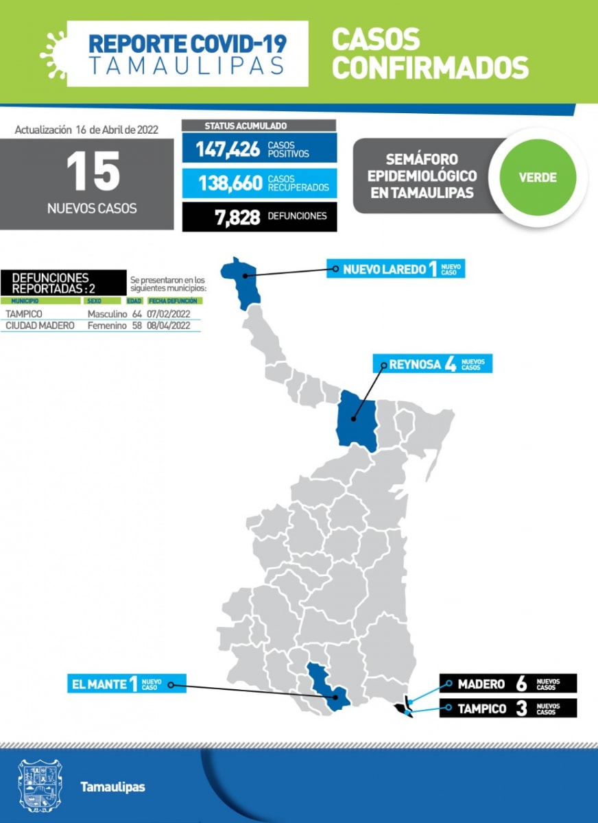CIUDAD VICTORIA, TAMAULIPAS.- En su reporte técnico de este sábado, la Secretaría de Salud de Tamaulipas confirmó 15 nuevos casos de COVID-19 y 2 fallecimientos, por lo que insistió en su llamado a no bajar la guardia, ni relajar las medidas de prevención ya conocidas para seguir con el descenso en el número de casos.