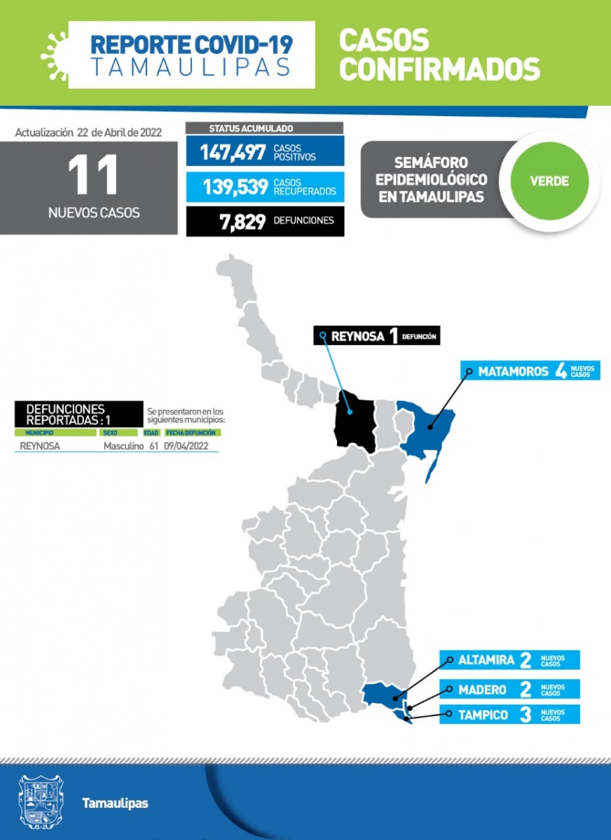 CIUDAD VICTORIA, TAMAULIPAS.- La pandemia de COVID-19 sumó este viernes 11 nuevos casos y 1 fallecimiento a su conteo oficial, informó en su reporte técnico la Secretaría de Salud de Tamaulipas.