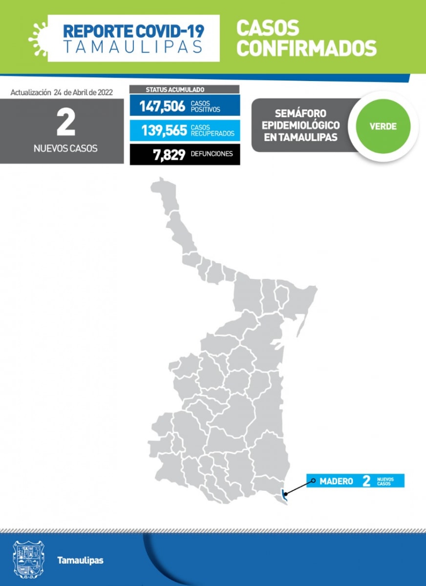 CIUDAD VICTORIA, TAMAULIPAS.- Tamaulipas cerró la jornada de este domingo con 2 pacientes positivos a COVID-19, informó en su reporte diario la Secretaría de Salud, destacando además que no se registraron defunciones por el virus.