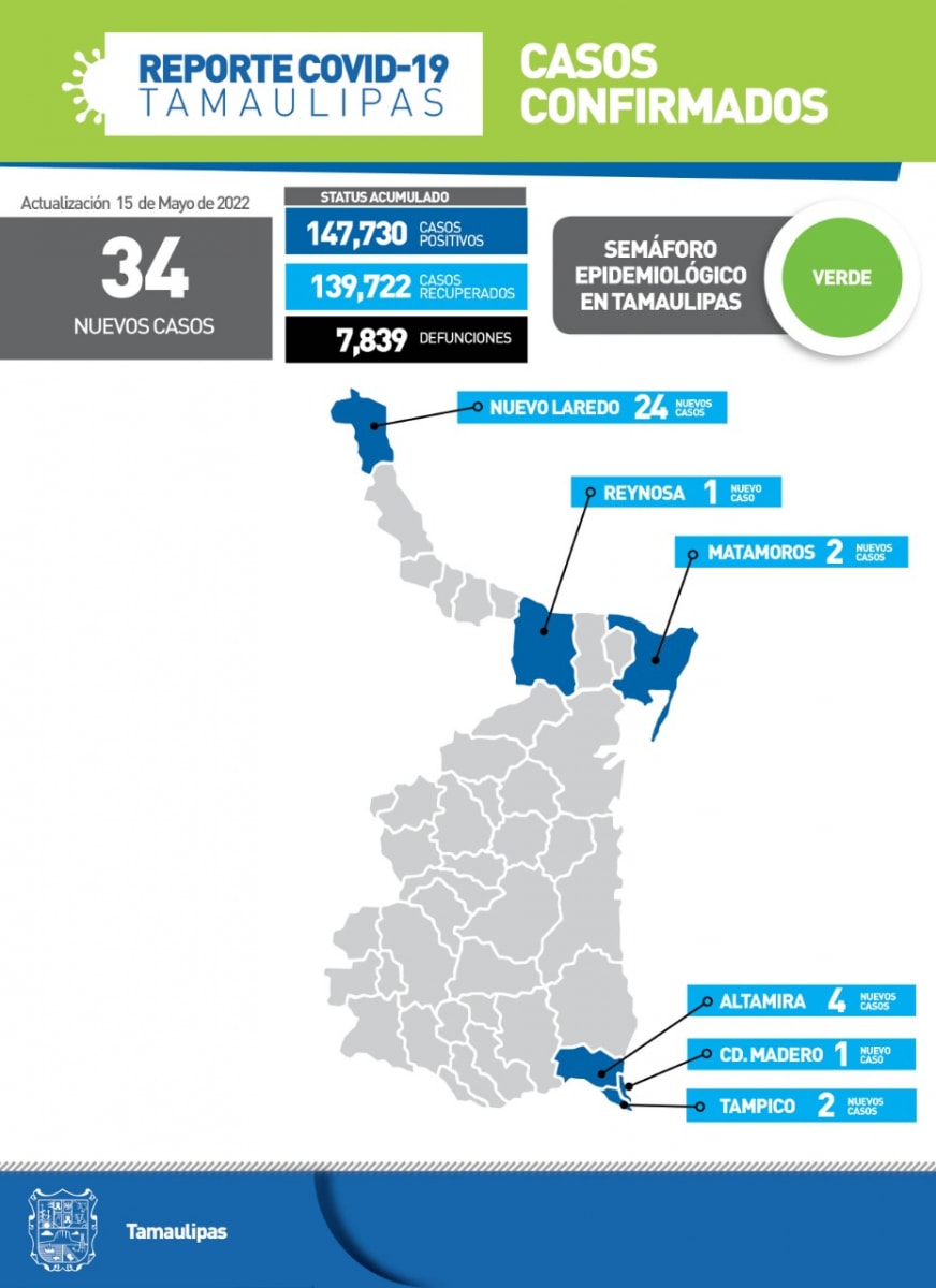CIUDAD VICTORIA, TAMAULIPAS.- Durante las últimas 24 horas Tamaulipas registró 34 nuevos casos de COVID-19 y ningún fallecimiento, precisó en su reporte diario la Secretaría de Salud.