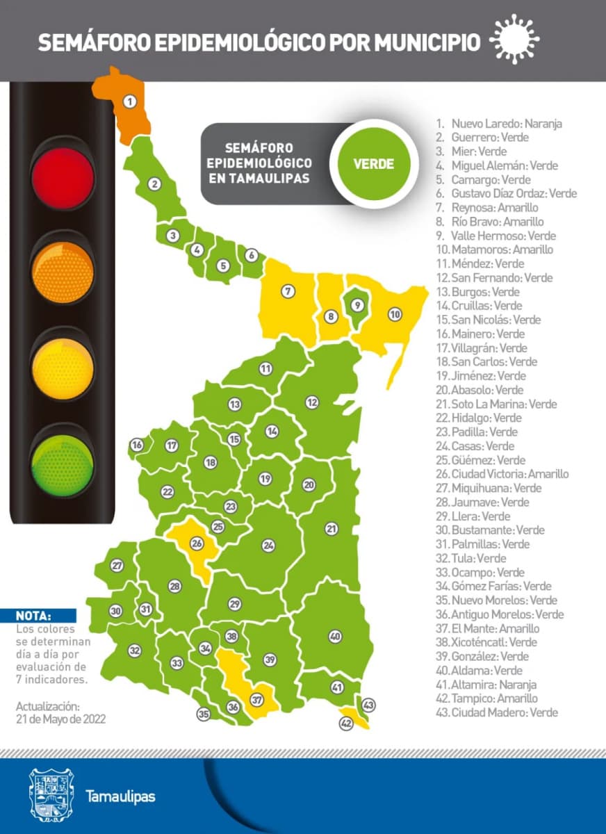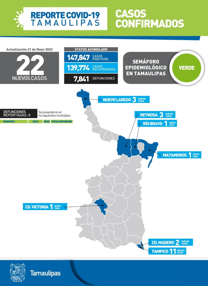 CIUDAD VICTORIA, TAMAULIPAS.- En su reporte técnico de este sábado, la Secretaría de Salud de Tamaulipas confirmó 22 nuevos casos de COVID-19 y aunque no registró fallecimientos asociados al virus, exhortó a la población a proteger a los más vulnerables y completar el esquema de vacunación.