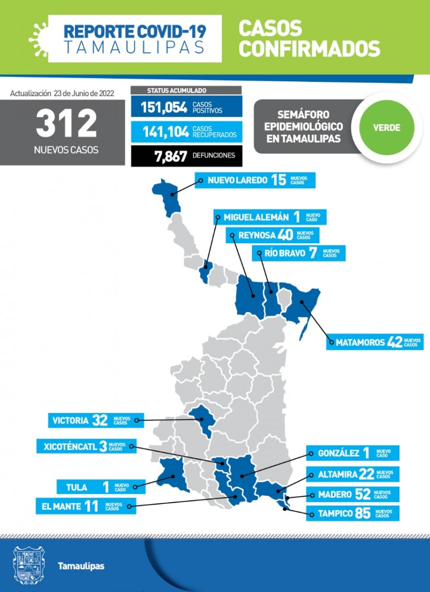 CIUDAD VICTORIA, TAMAULIPAS.- Aunque la jornada de este jueves transcurrió sin fallecimientos asociados a COVID-19, fueron confirmados 312 nuevos casos de la enfermedad en Tamaulipas, informó la secretaria de Salud, Gloria Molina Gamboa al presentar el reporte diario.