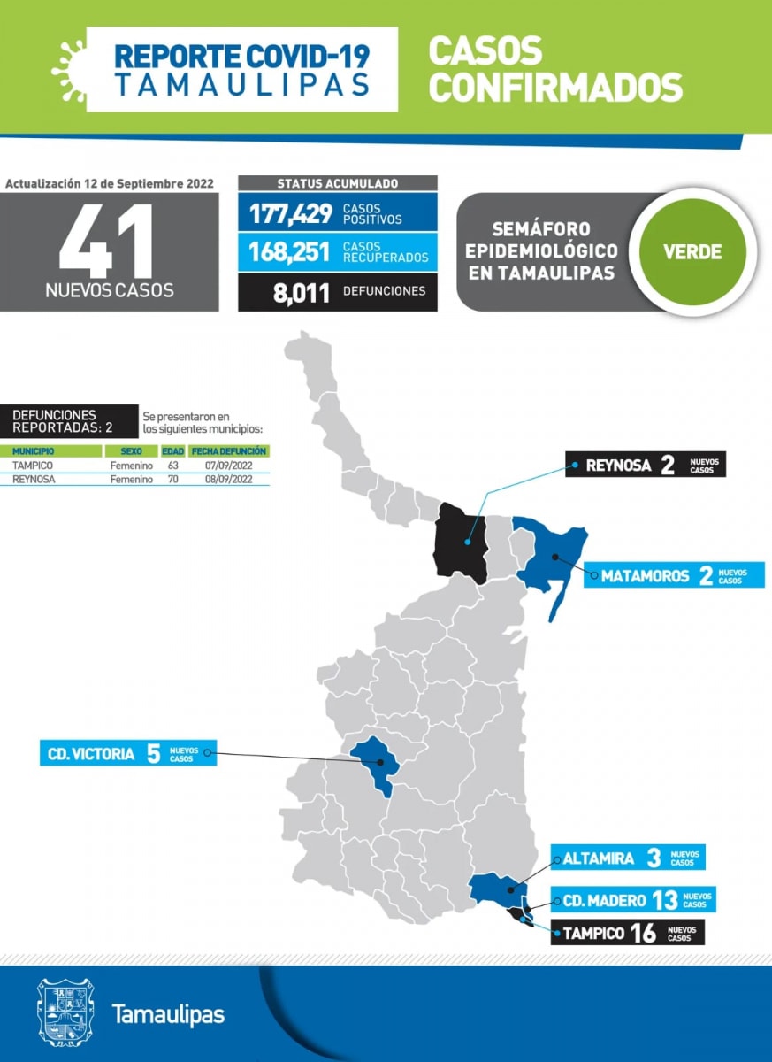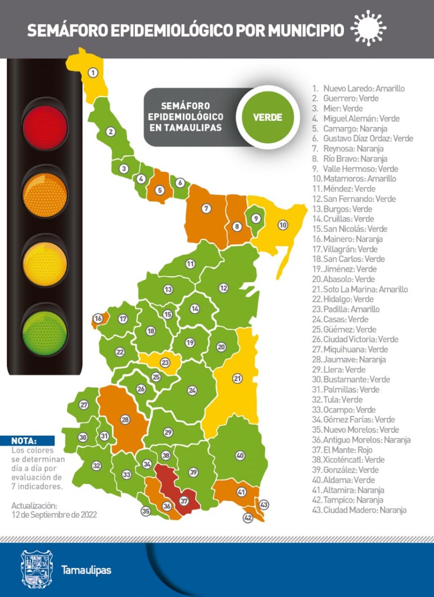 Precisó que Tamaulipas se mantiene en semáforo epidemiológico color verde, sin embargo el riesgo de contagio sigue presente, de ahí la importancia de atender en todo momento medidas de seguridad sanitaria como el uso del cubrebocas, el lavado frecuente de manos y la sana distancia, principalmente.