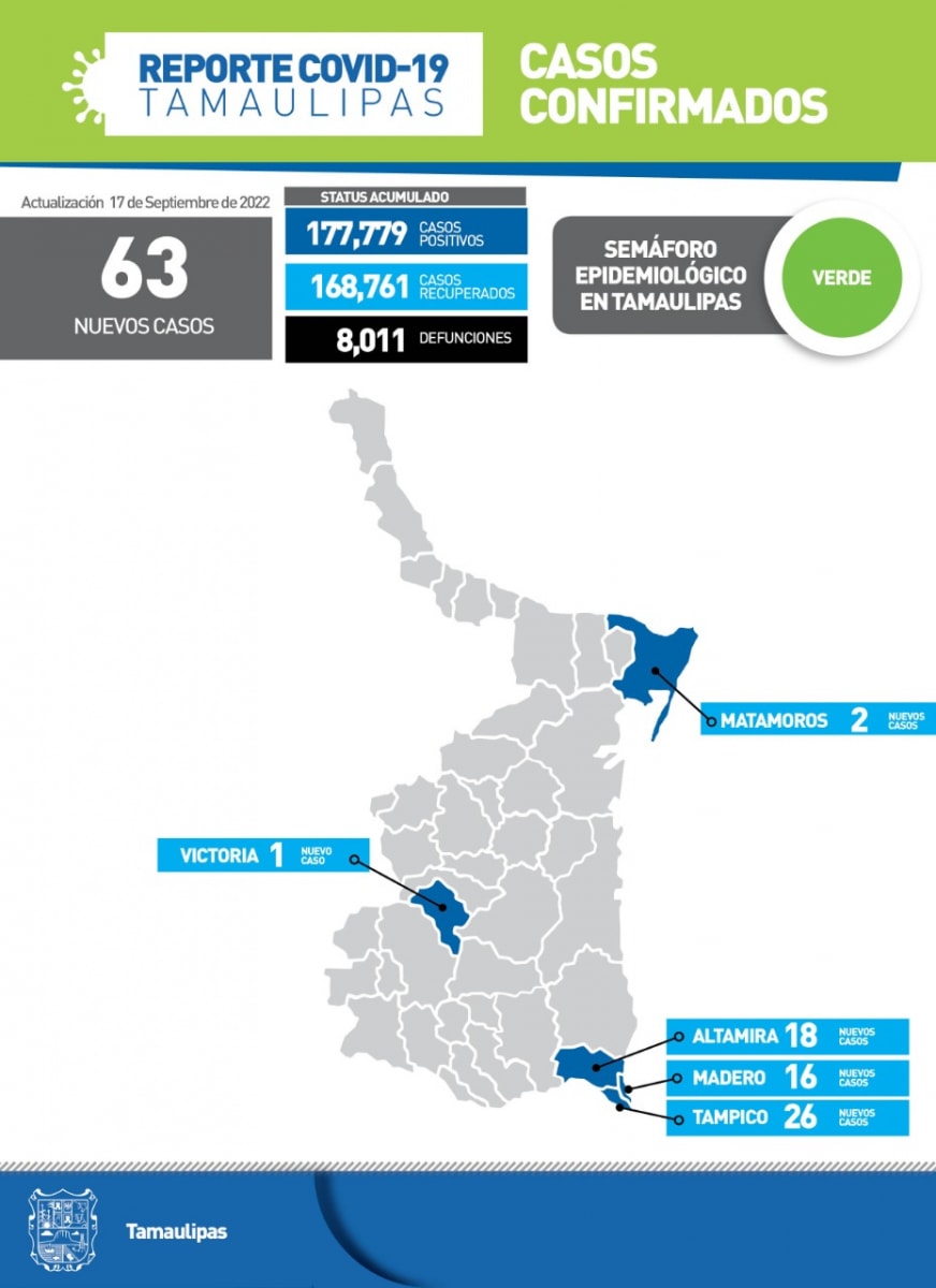 CIUDAD VICTORIA, TAMAULIPAS.- Tamaulipas cerró la jornada de este sábado con 63 nuevos contagios de COVID-19, informó en su reporte técnico diario, la secretaria de Salud, Gloria Molina Gamboa quien pidió a la población no confiarse, ya que la pandemia no ha terminado.