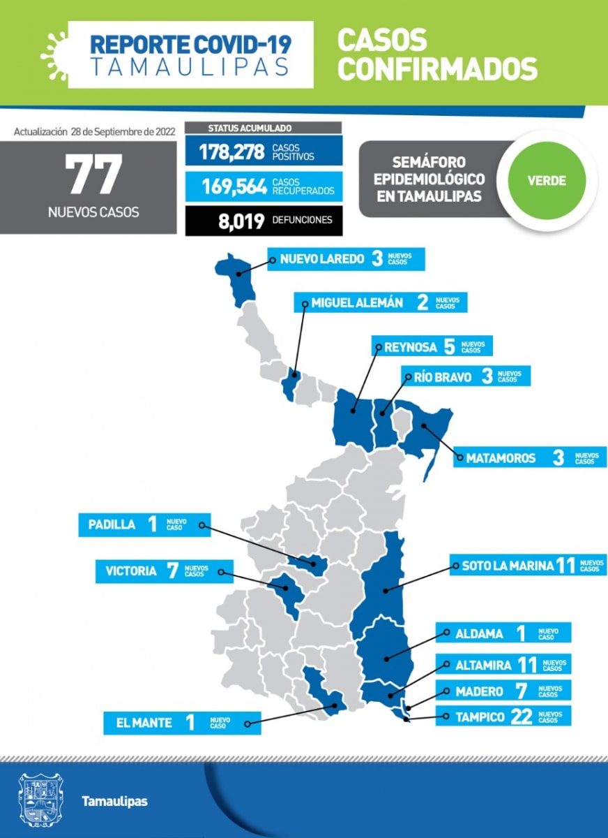 CIUDAD VICTORIA, TAMAULIPAS.- Al confirmar 77 nuevos casos de COVID-19, la secretaria de Salud de Tamaulipas, Gloria Molina Gamboa señaló que la pandemia sigue activa por lo que insistió en no relajar las medidas preventivas y completar el esquema de vacunación.