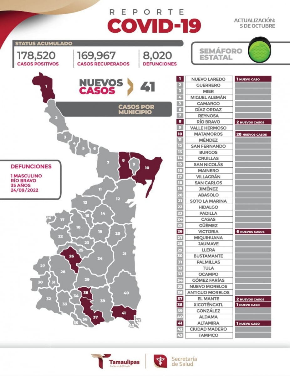 El secretario de Salud de Tamaulipas, Vicente Joel Hernández Navarro informó que durante la jornada de este miércoles se registraron 41 nuevos casos de COVID-19 y un fallecimiento asociado a complicaciones graves por el virus.