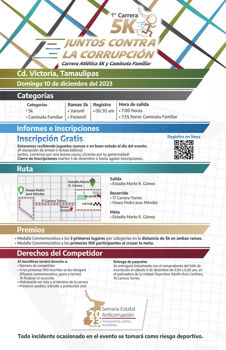 La Semana Estatal Contra la Corrupción, es un espacio que nos permite promover y fomentar en la sociedad la importancia de prevenir y combatir la corrupción, es por ello que en conmemoración al día Internacional Contra la Corrupción, se llevará a cabo la Carrera Juntos Contra la Corrupción, la cual tiene como objetivo llegar a toda la sociedad Tamaulipeca, con el firme mensaje que en Tamaulipas se combate a la corrupción, y se fortalece el tejido social como símbolo de prevención de este mal.