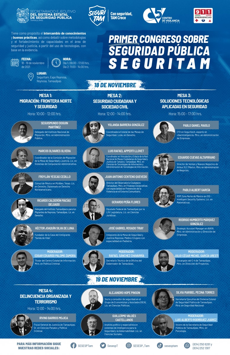 El Gobierno del Estado por medio del Secretariado Ejecutivo del Sistema Estatal de Seguridad Pública, tiene el placer de invitarte al Primer Congreso sobre Seguridad Pública Seguritam, el cual tiene como propósito el intercambio de conocimientos y buenas prácticas, así como debatir sobre metodologías y el fortalecimiento de capacidades en el área de seguridad y justicia, a partir del uso de tecnologías, con base de evidencias.