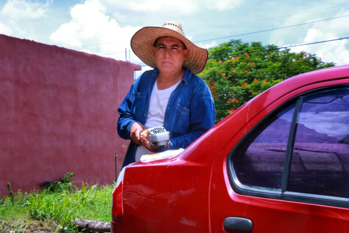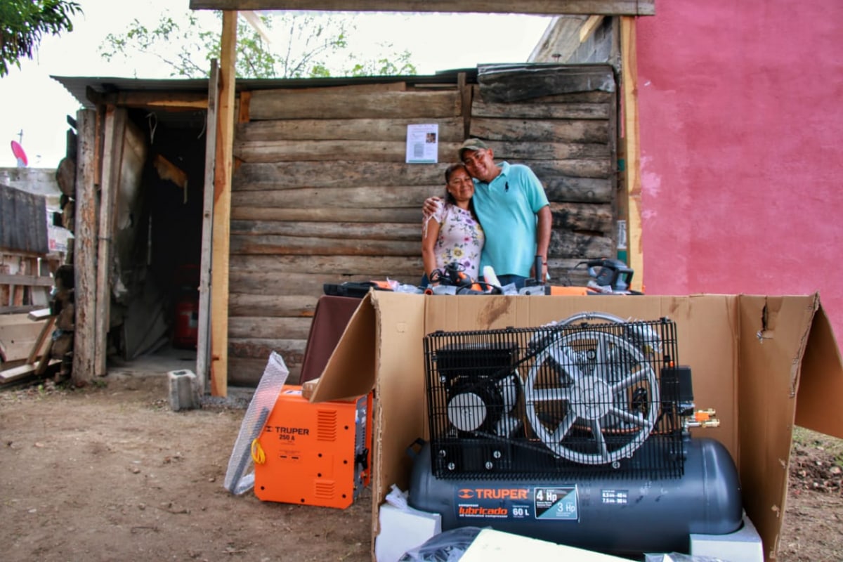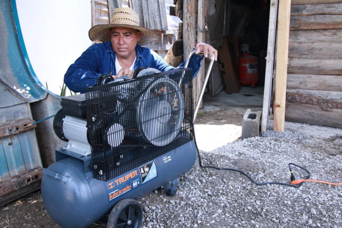 Tal es el caso de Marcos Ibarra Maldonado, quien cuenta con su taller de hojalatería y pintura; “Taller Ibarra”, recibió del gobierno un compresor, una máquina pulidora, un esmeril, una lijadora, una pistola de calor y un taladro roto martillo.