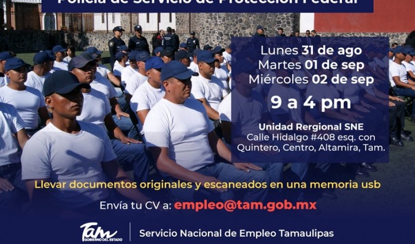 Ciudad Victoria Tamaulipas.- El Gobierno de Tamaulipas, a través de la Secretaría de Seguridad y Protección Ciudadana (SSPC) y el Servicio de Protección Federal (SPF), ofertará 450 vacantes para ingresar a las filas de esa corporación, como policías especializados, que brinden seguridad a instalaciones y edificios ubicados dentro de la entidad.