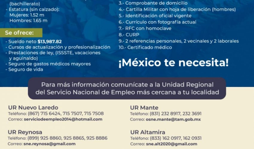 La convocatoria de reclutamiento, la llevará a cabo el Servicio Nacional de Empleo Tamaulipas (SNETam), en los municipios de Altamira, los días 31 de agosto, 1 y 2 de septiembre, en Ciudad Victoria los días 3, 4 y 5 de septiembre y Nuevo Laredo los días 7 y 8 de septiembre.