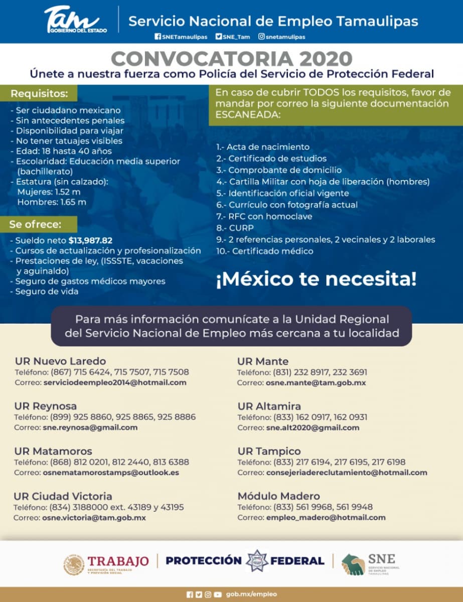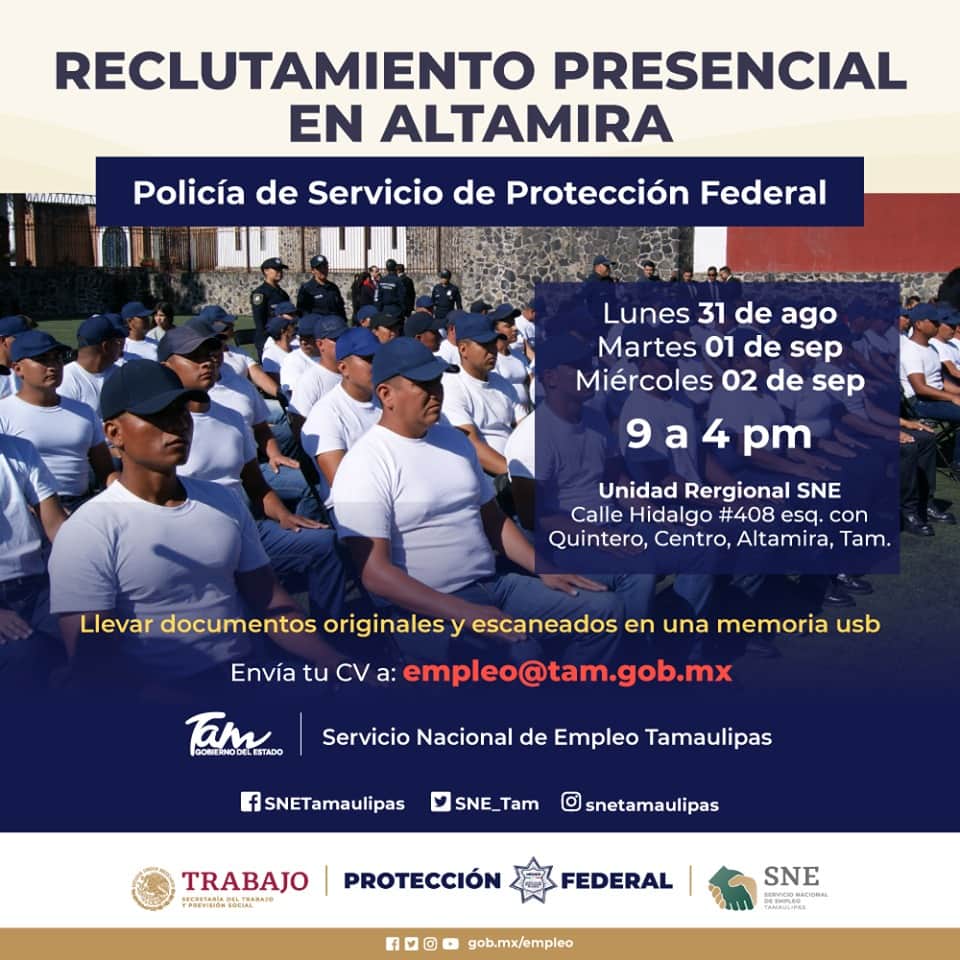 La convocatoria de reclutamiento, la llevará a cabo el Servicio Nacional de Empleo Tamaulipas (SNETam), en los municipios de Altamira, los días 31 de agosto, 1 y 2 de septiembre, en Ciudad Victoria los días 3, 4 y 5 de septiembre y Nuevo Laredo los días 7 y 8 de septiembre.