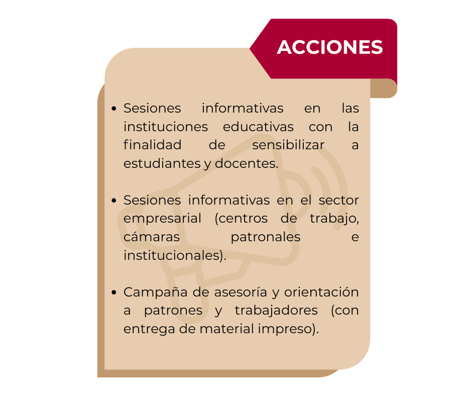 El departamento de Trabajo de Menores se encarga de prevenir y erradicar el trabajo infantil, promoviendo y protegiendo los derechos laborales de los adolescentes en edad permitida para trabajar. Para ello, realiza sesiones informativas en escuelas y centros de trabajo, campañas de asesoría para empleadores y trabajadores, difunde los derechos laborales de los adolescentes y comunica las sanciones por la contratación ilegal de menores.