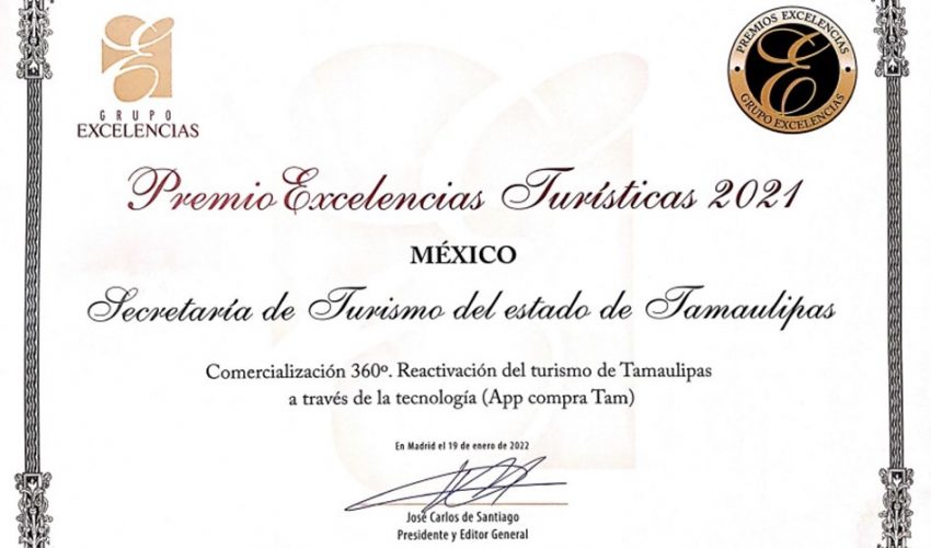 Madrid, España.- El estado de Tamaulipas fue reconocido por tercer año consecutivo con el premio “Excelencias Turísticas”, galardonando el proyecto “Comercialización 360°, reactivación del turismo de Tamaulipas a través de la tecnología”, esto mediante la aplicación “Compra Tam”.