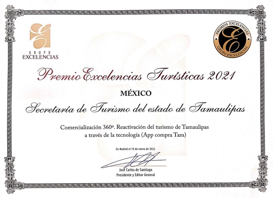 Madrid, España.- El estado de Tamaulipas fue reconocido por tercer año consecutivo con el premio “Excelencias Turísticas”, galardonando el proyecto “Comercialización 360°, reactivación del turismo de Tamaulipas a través de la tecnología”, esto mediante la aplicación “Compra Tam”.